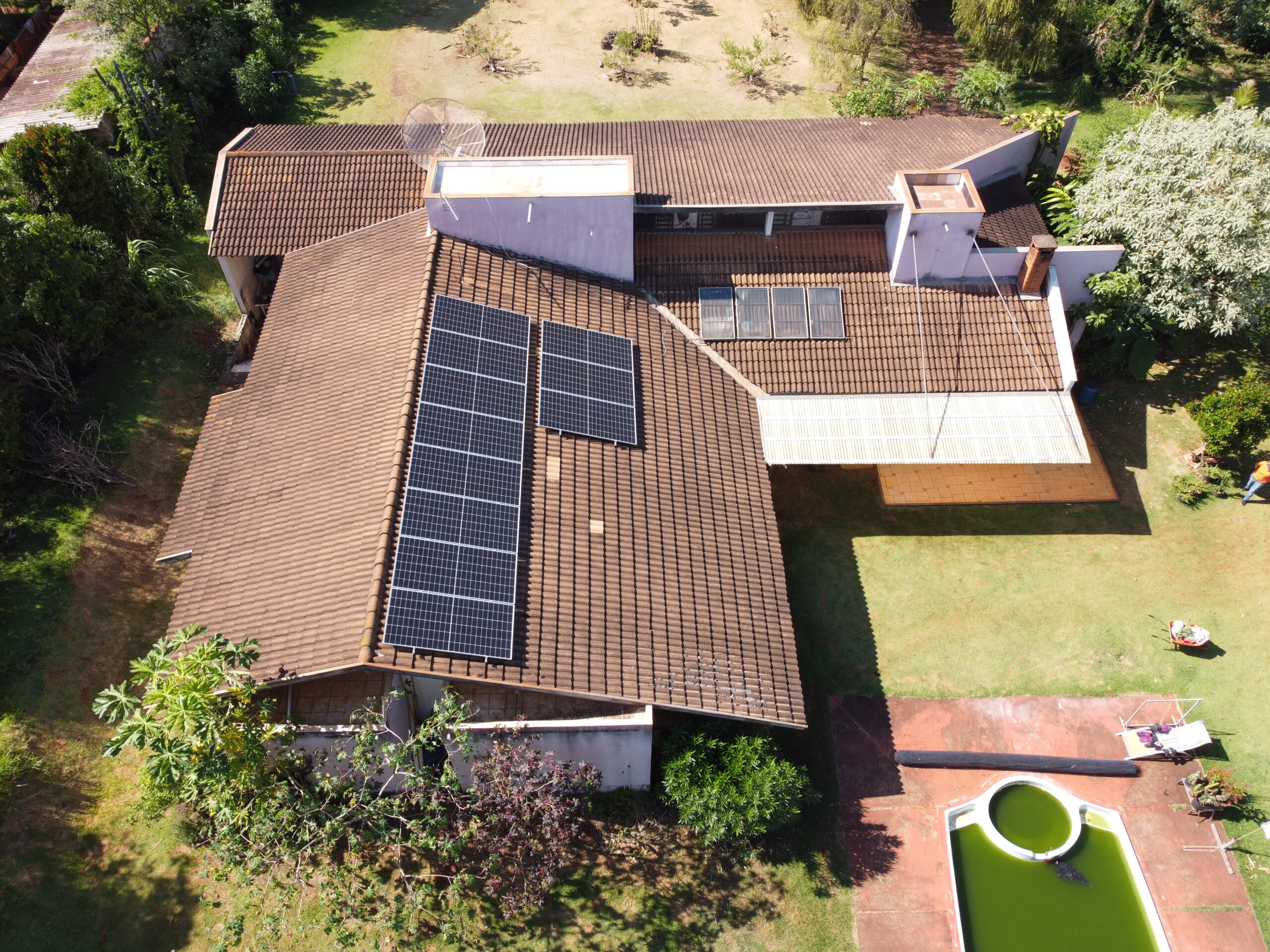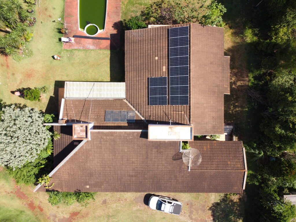 Sistema composto por 13 módulos fotovoltaicos de 550W, totalizando uma potência de pico de 7,15 kWp.
